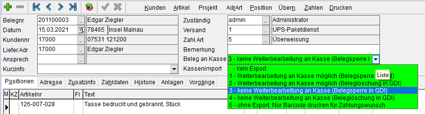 Freigabe eines Beleges zum Import an der Kasse