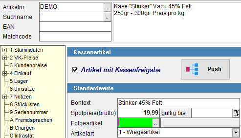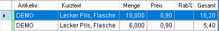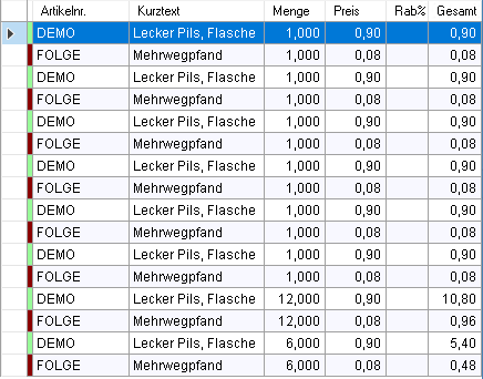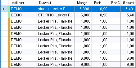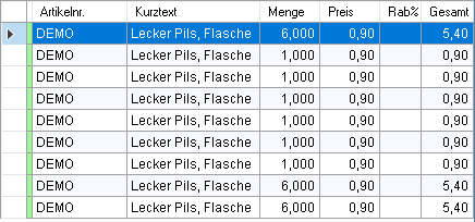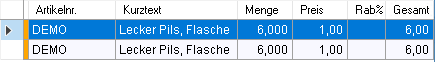 Ausgehend vom 1. Bild des Beispiels wird die Artikelnr. "DEMO" 6* einzeln erfasst und dann nochmal der Barcode 25000000: