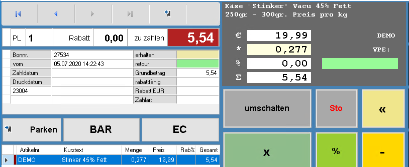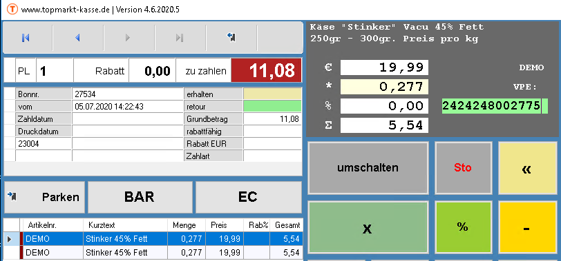 An der Kasse wurde der Barcode 25000000 2 mal erfasst. Die gelbe Farbe signalisiert das ein Mengenrabatt möglich, aber noch nicht erreicht wurde.