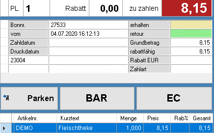 Für Artikel "DEMO" öffnet sich das Eingabepad für Preis an der Kasse