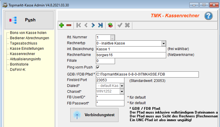 Die Einstellungen zum Verbinden der verwendeten FirebirdSQL Datenbanken finden Sie um TMK-Admin unter dem Menu Kassenrechner.