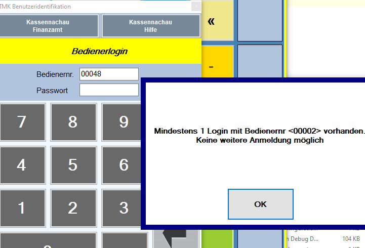 Wichtig: verlässt ein Mitarbeiter seinen Arbeitsplatz oder vergisst er seine Kassensitzung zu beenden kann mit einem dieser Passwörter ein Login mit der Benutzerkennung durchgeführt werden, die eine weitere Anmeldung blockiert. Im unteren Screenshot müsste ein Login mit der Bedienernr. <00002> vorgenommen werden um die Kasse zu entsperren. Ist das Passwort nicht bekannt kann eines der hier eingegeben Passwörter verwendet werden.