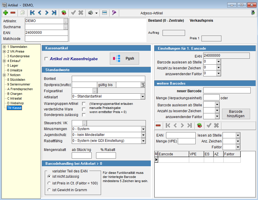 Um die verschiedenen Funktionen zu verdeutliche wurden 2 Demoartikel (DEMO und FOLGE) angelegt.