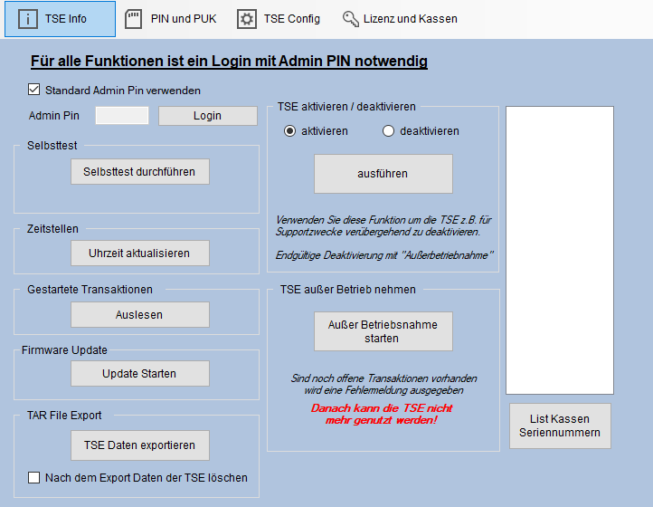Auf dieser Seite können Sie den Zustand der TSE überprüfen, diese vorübergehend deaktivieren oder endgültig außer Betrieb nehmen.