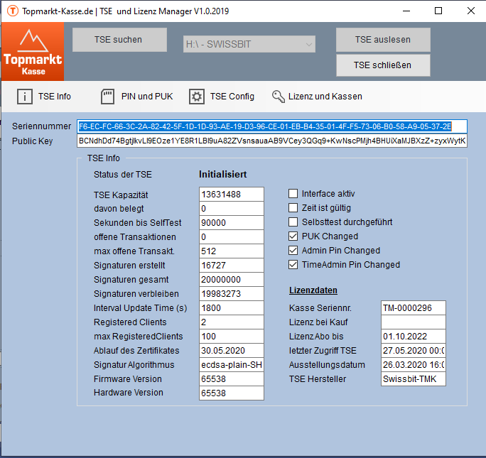 Die wichtigsten Informationen für Sie als Anwender sind die Informationen zum Ablauf der Zertifikates und die verbleibenden Signaturen. Aktuell werden Swissbit TSE's mit einer Zertifikatgültigkeit von 5 Jahren und 8 Millionen möglichen Signaturen ausgeliefert. Nach Erreichen einer dieser Grenzwerte ist die TSE nicht mehr nutzbar.